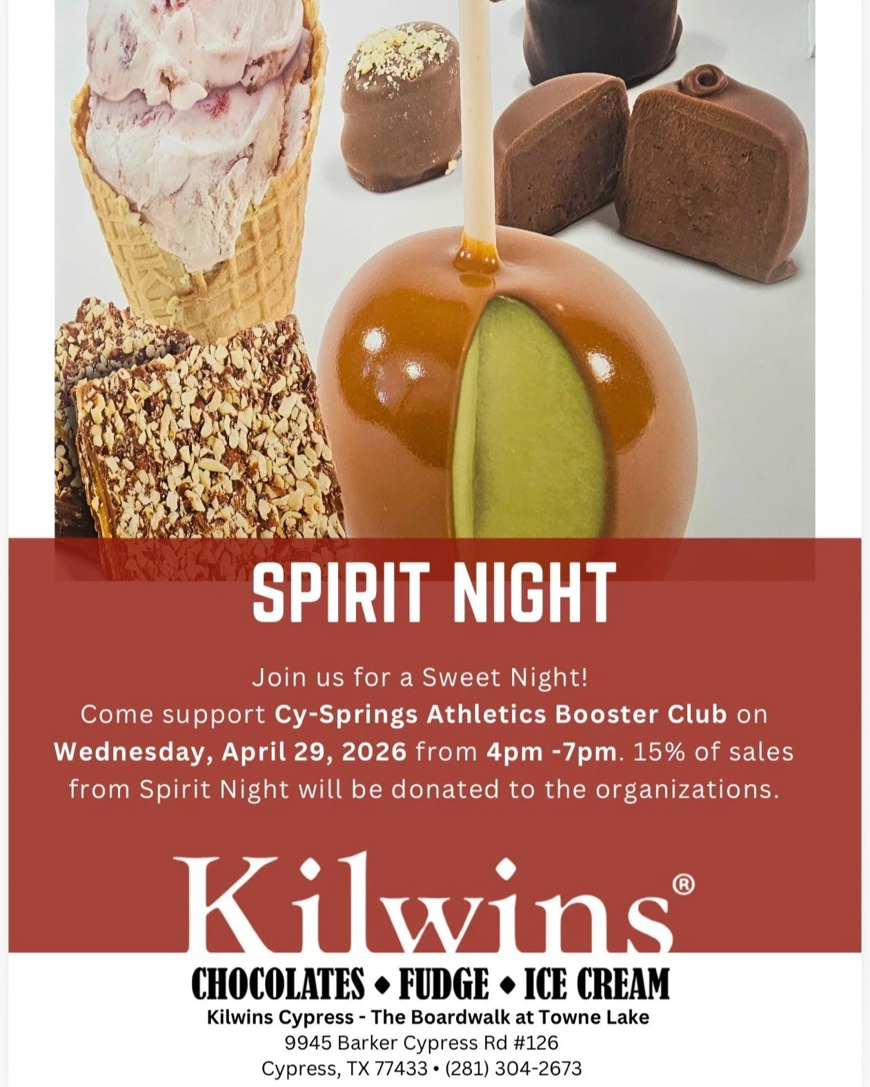 Please join us for a Sweet Night at Kilwins! Support YOUR Cy-Springs Athletic Booster Club today!